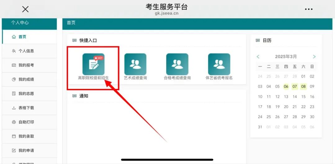 2.登陆进入后,点击主页快捷入口中“高职院校提前招生”。