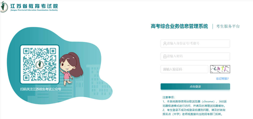 1.登录江苏省教育考试院网站考生服务平台(gk.jseea.cn),点击网址进入考生服务平台后,按要求输入身份证号、密码、验证码。