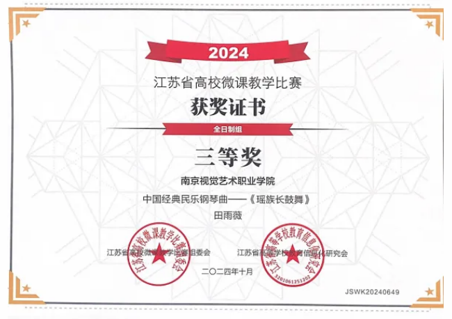 喜报|我院音乐系教师田雨薇荣获2024年江苏省高校微课教学比赛三等奖